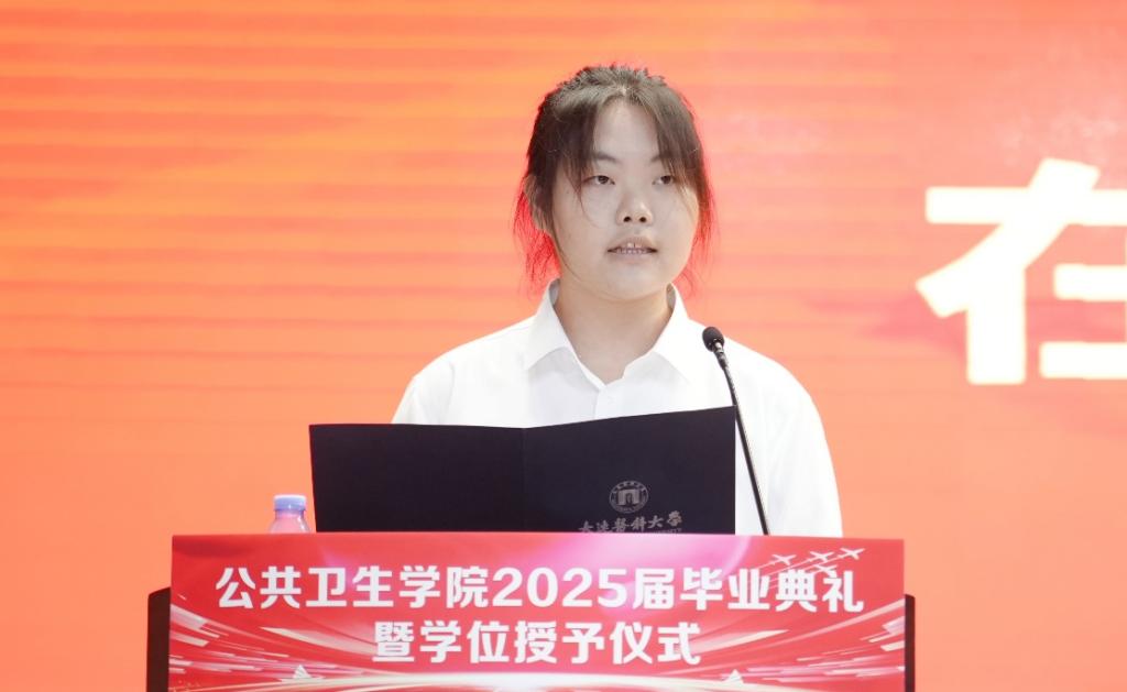 孙鲜策代表学院向圆满完成学业的毕业生致以热烈祝贺,并分享了自己求学时的难忘片段,以此引出对青春感悟的思考。她以三条成长路径寄语毕业生:一是“向上生长”,勉励同学们坚守科学精神、勇于推倒重来,以热爱与担当面对挑战,在顺逆之境中保持良知与尊严;二是“向下扎根”,强调公卫人的价值在于立足人民需求、扎根平凡岗位,无论身处实验室或基层,都应如疫苗般无声守护,永葆服务健康事业的初心;三是“归家之路”,提醒毕业生珍视家庭,承担起为人子女、伴侣与父母的责任,让爱成为前行的力量与归航的港湾。最后,院长深情祝福毕业生心途坦荡、执着追光,前程锦绣、幸福安康,脚下有路、心中有光。