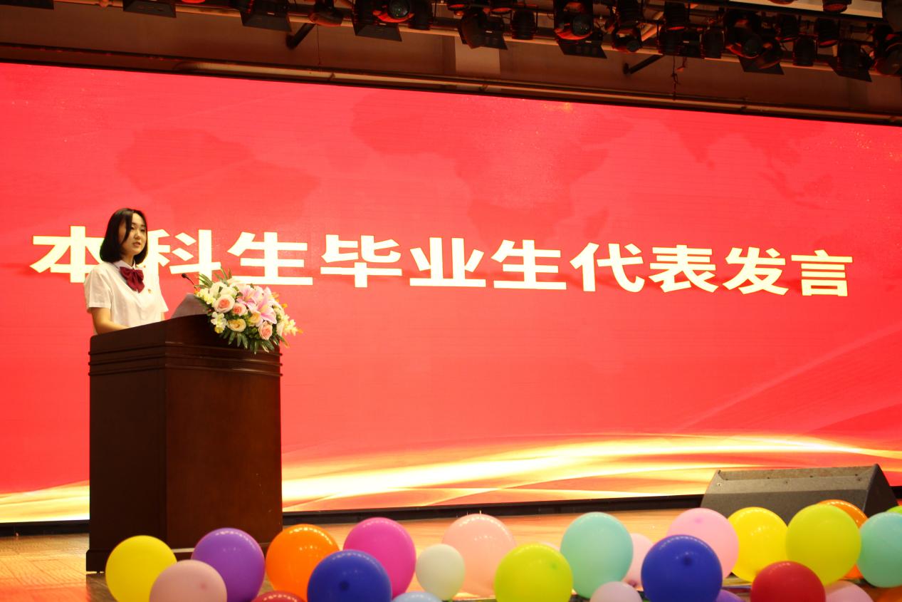 本科毕业生杨舒涵同学代表全体本科毕业生上台发言,她分享了自己五年来的所得与感悟,表达了对学弟学妹的期待与祝福,希望以后的学弟学妹们可以在今后的学业上熠熠生辉。
