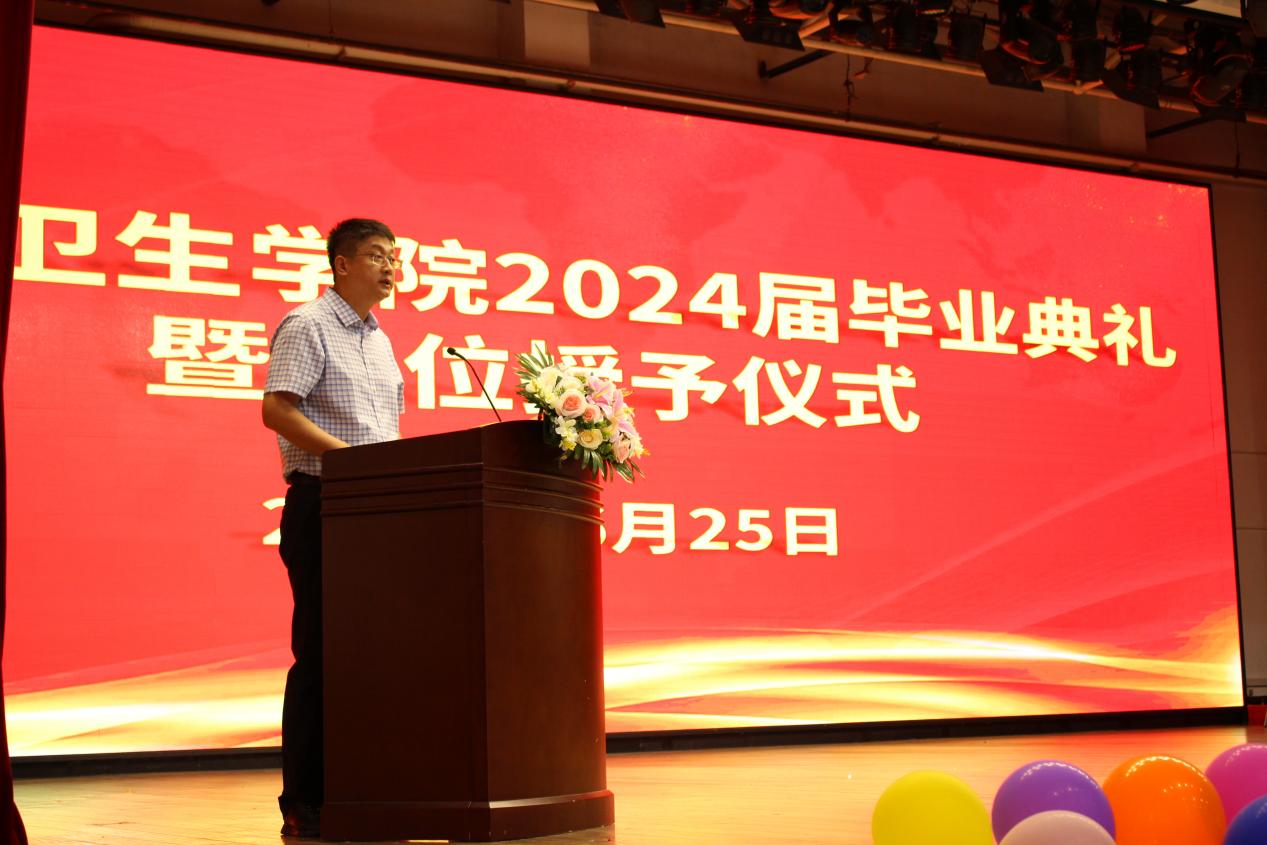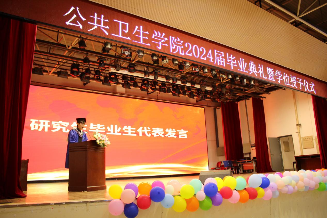 研究生毕业生代表陈政国分享了三年来的所得所思,表达了对大医母校和老师的感恩与美好祝愿,并号召全体毕业生锚定未来,踏浪而去,开启人生的新篇章。