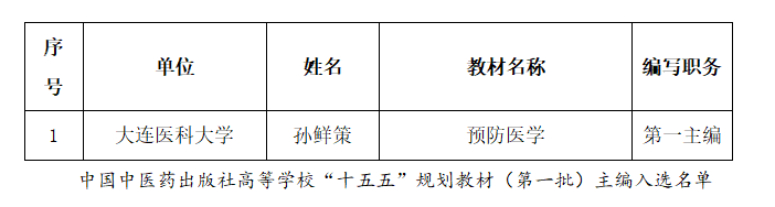 根据中国中医药出版社高等学校“十五五”规划教材(第一批)编者遴选工作安排,经学院申报、学校推荐、专家评审等相关程序,开云官网孙鲜策教授遴选为中国中医药出版社《预防医学》规划教材第一主编。