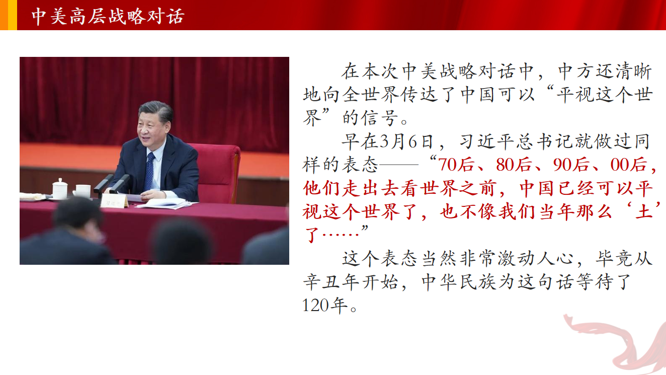 徐文彬以中美高层战略对话为切入点,从“平视这个世界”、“不堪回首的弱国外交”、“峥嵘笃定的大国外交史”和“征途漫漫,惟有奋斗”四个方面与同学们进行了深入的分享和交流。大会上,全体同学通过视频回顾了中美高层战略对话现场,“你们没有资格在中国面前说,你们从实力的地位出发同中国谈话”、“中国人不吃这一套”等金句让现场同学热血沸腾,也让大家更加深刻的认识和理解了习近平总书记的时代声音—“中国已经可以平视这个世界”。